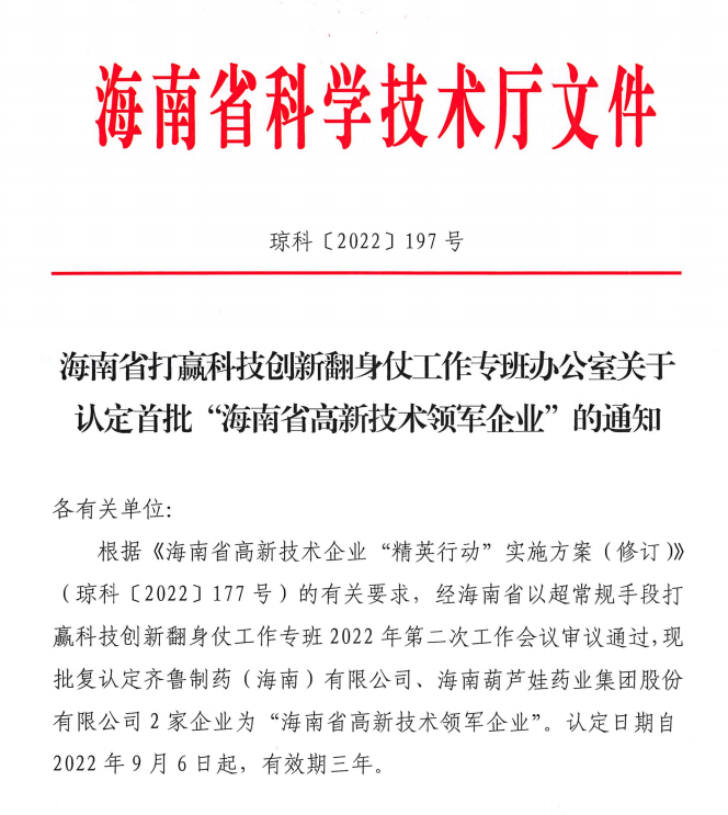 近日,海南省科学技术厅发布的《海南省打赢科技创新翻身仗工作专班办公室关于认定首批“海南省高新技术领军企业”的通知》中显示,批复认定海南巅峰国际药业集团股份有限公司等2家企业为“海南省高新技术领军企业”。认定日期自2022年9月6日起,有效期三年。